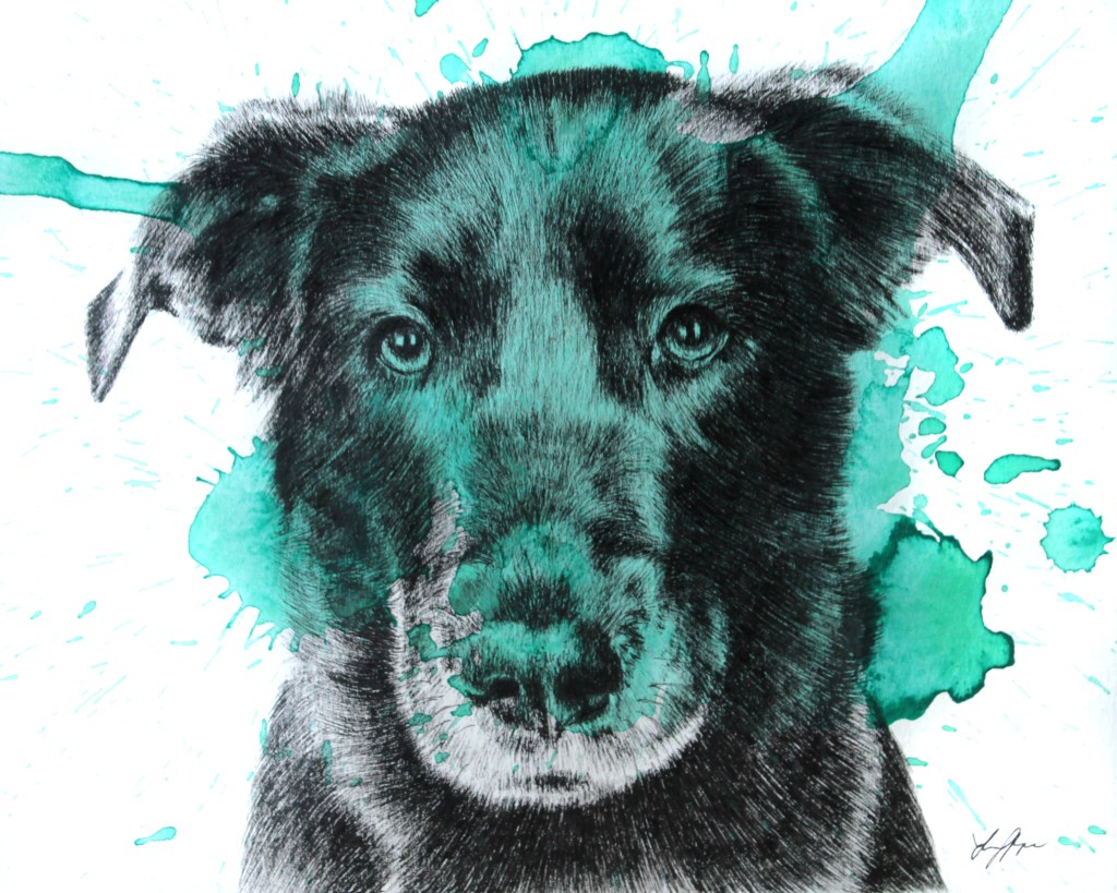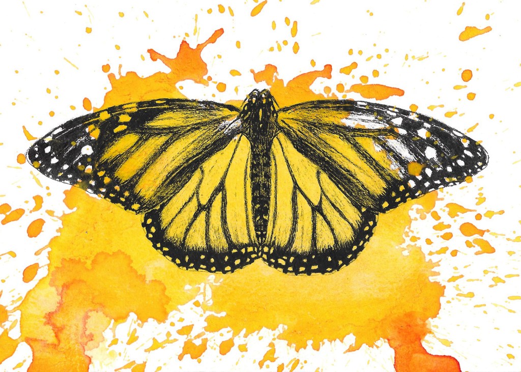 Once everything is dry, you have to go back over the ink parts of the drawing that are covered by splatter, so they stand out. This will blunt the tip of your ink pen, but it’s worth it to get a really nice bold effect. And then you’re done! I love these types of drawings, they’re a unique and fun way to bring some colour and character to a subject while still drawing realism.