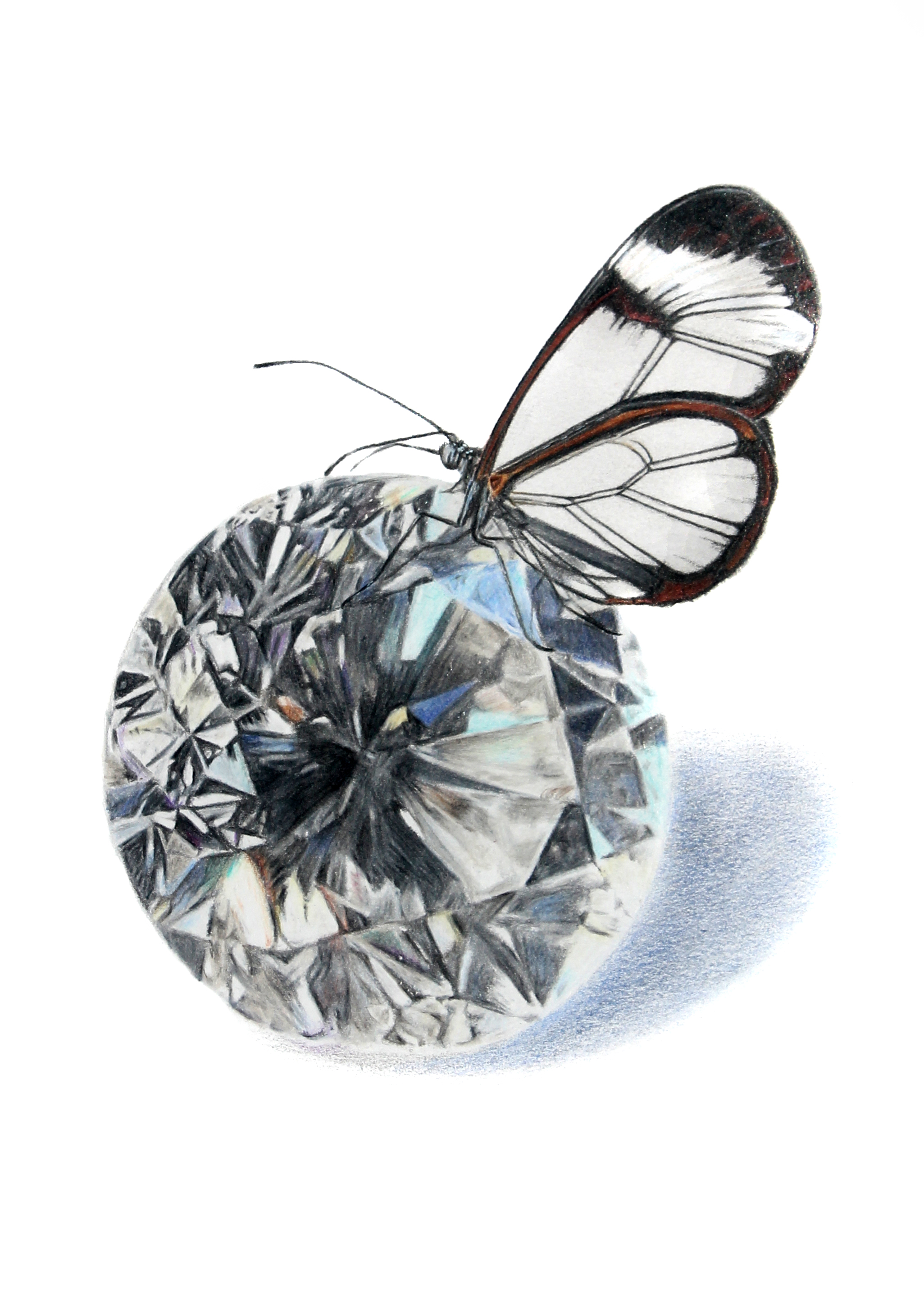 April: Diamond – Glasswing Butterfly – 5×7 Coloured Pencil